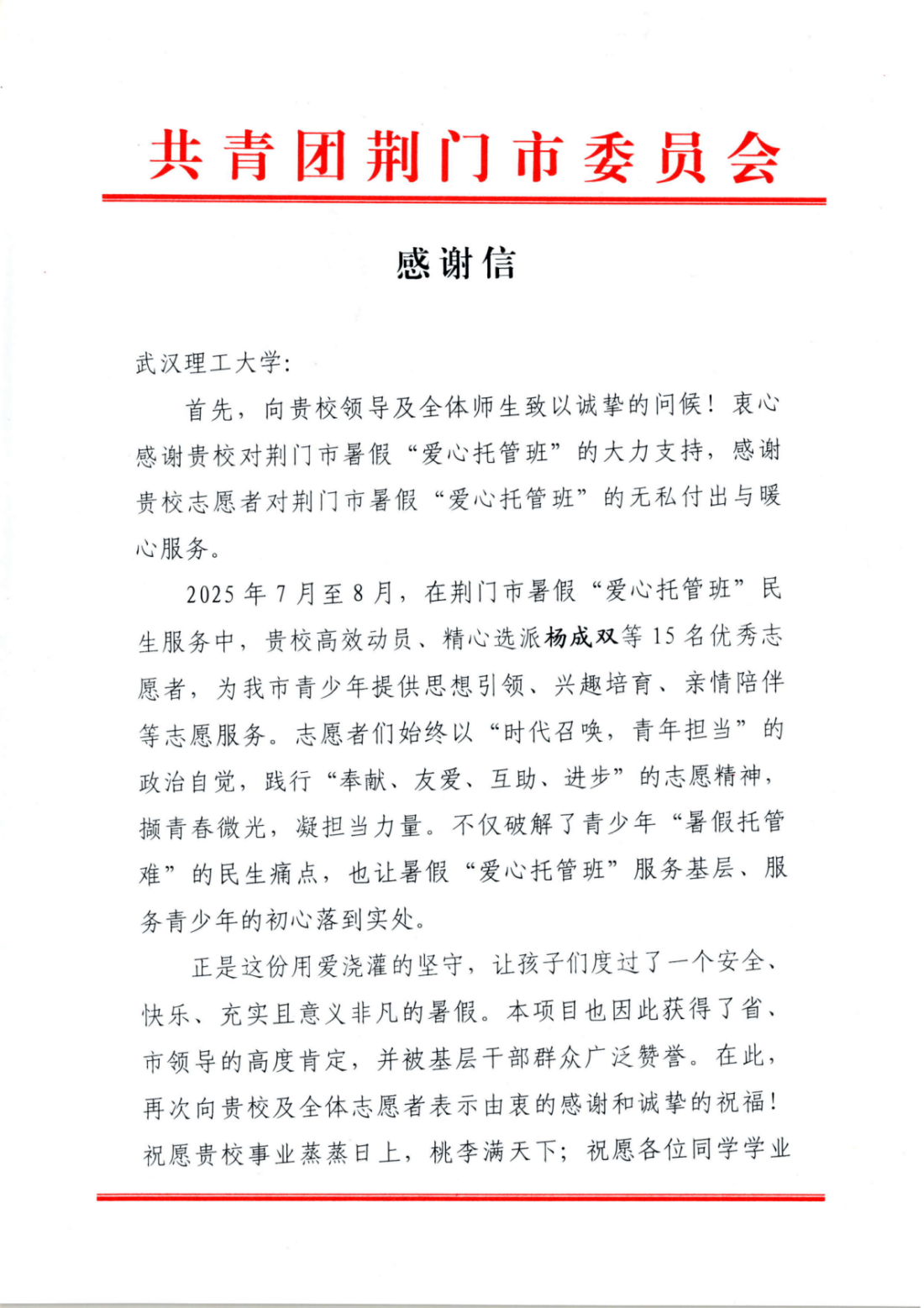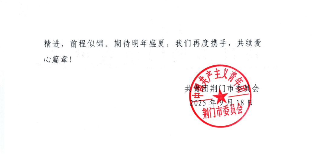 9月18日,成人电影 郎坤志愿服务队组建的“红润童心 青春笃行”暑期社会实践队的队员们收到了来自共青团荆门市委的一封感谢信,信中肯定了队员们的奉献付出,并对其表达了高度赞扬。